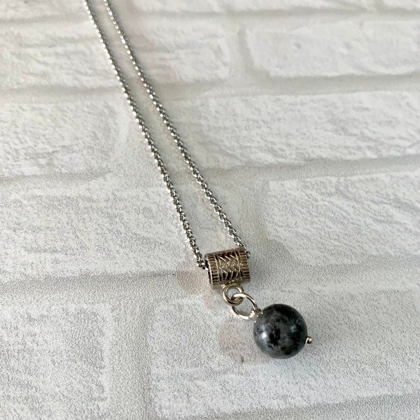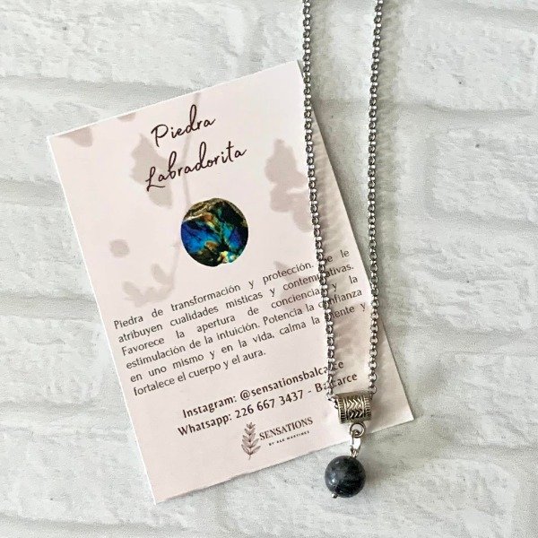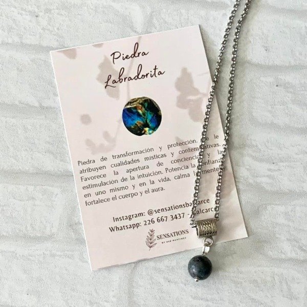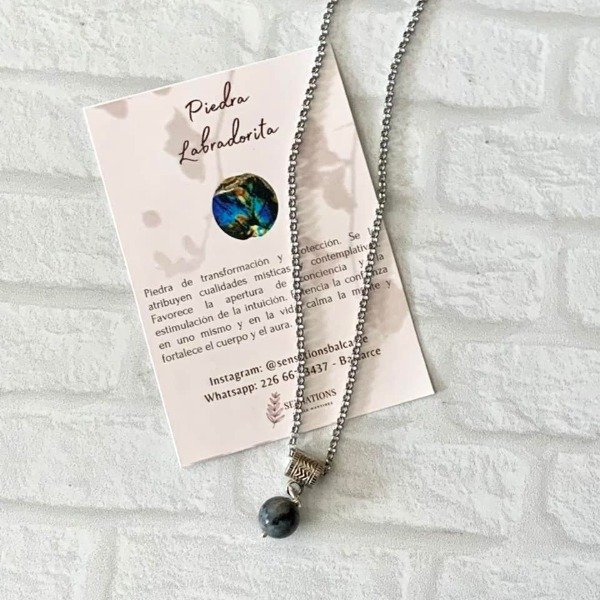 Cadena de acero quirúrgico con piedra natural: labradorita. Cada conjunto va acompañado de la tarjeta con las propiedades de la piedra.
