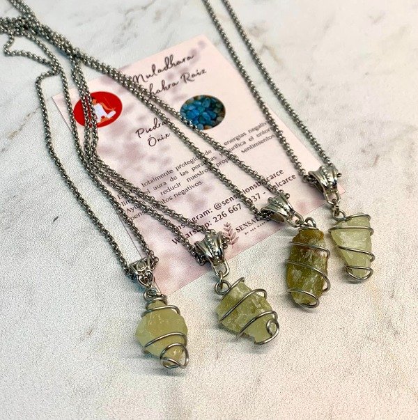 Cadena de acero quirúrgico con dije de piedra natural de ónix. Cada conjunto va acompañado de la tarjeta con las propiedades de la piedra.