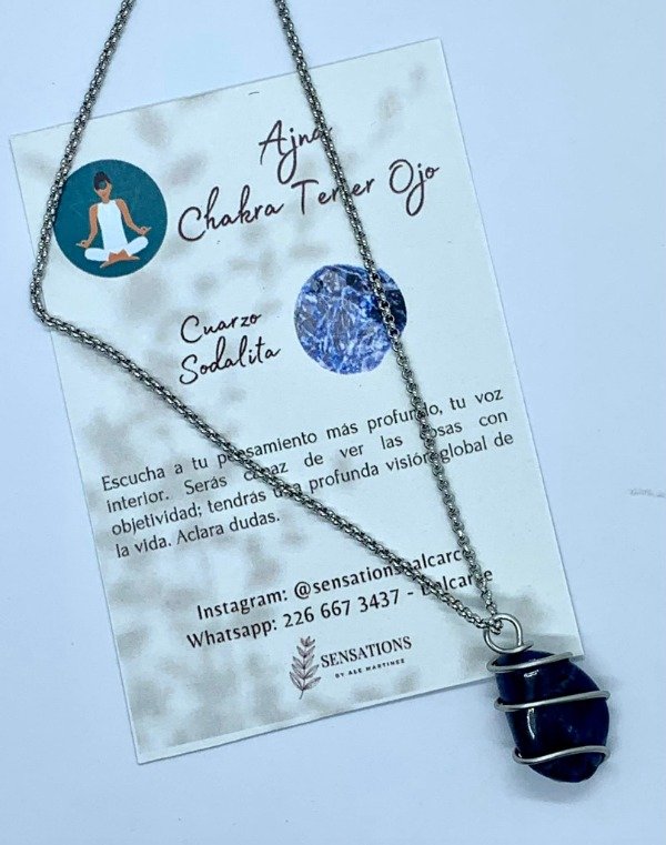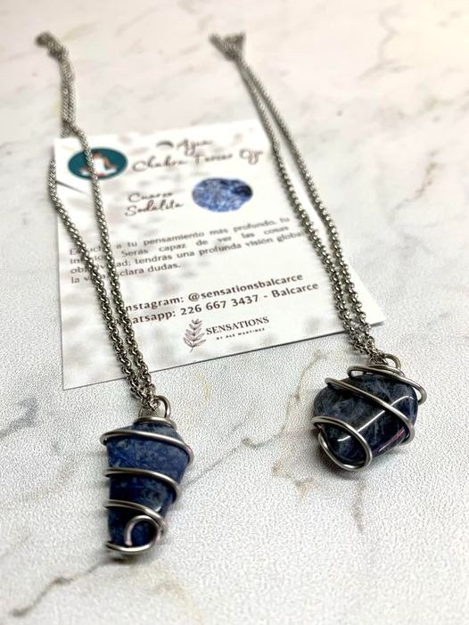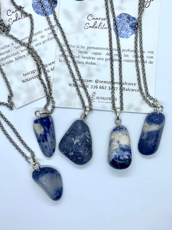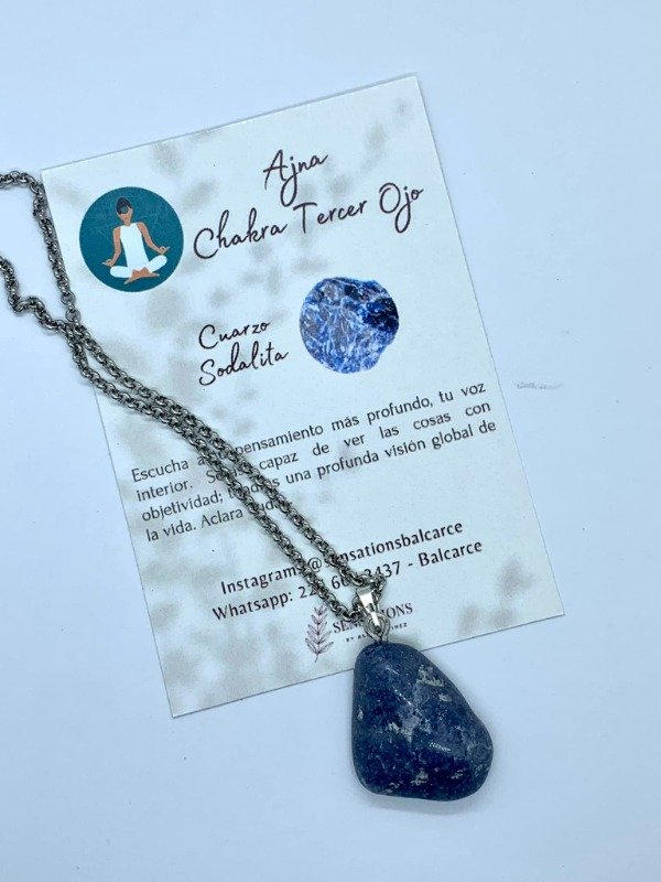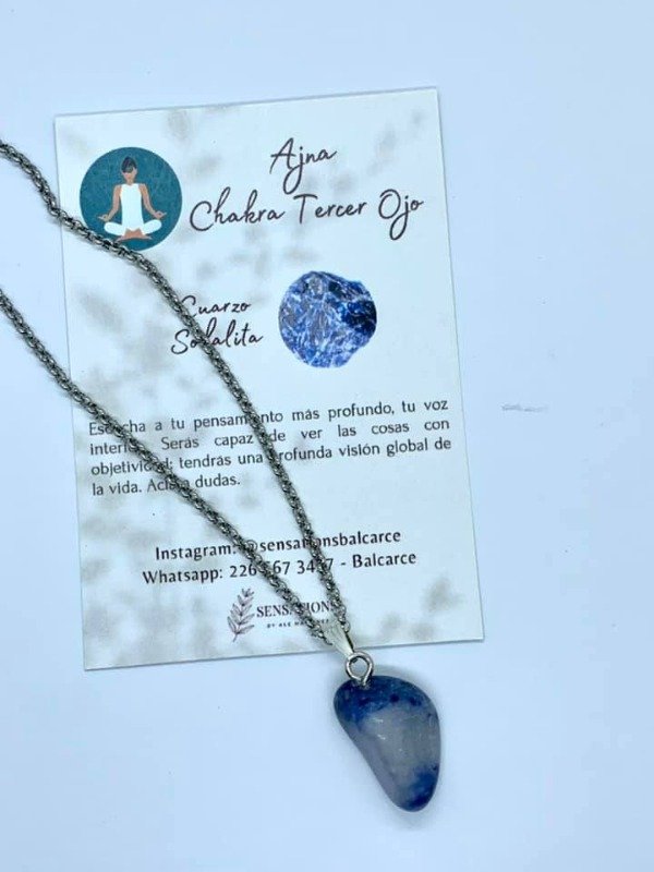 Cadena de acero quirúrgico con piedra natural: sodalita. Cada conjunto va acompañado de la tarjeta con las propiedades de la piedra.