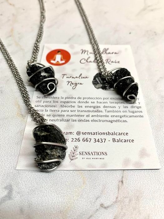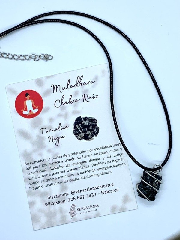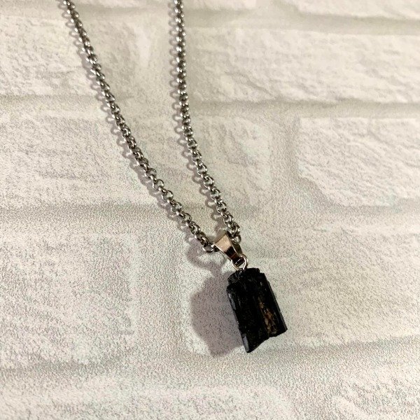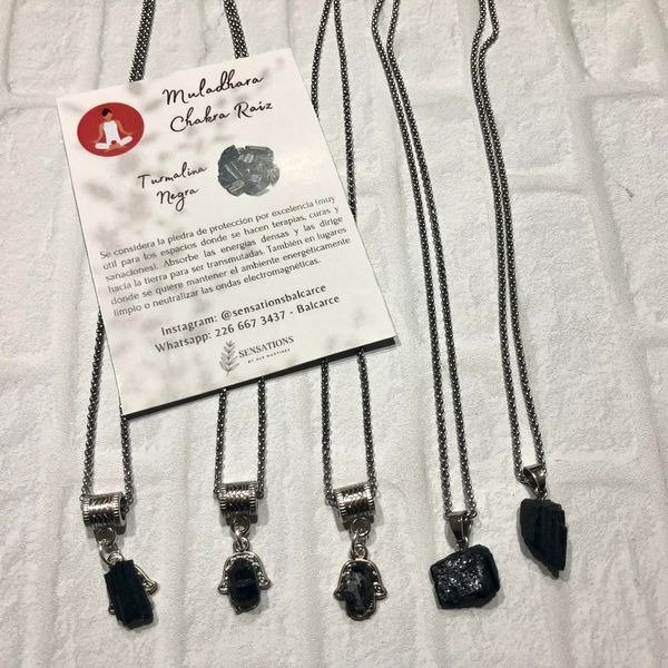 Cadena de acero quirúrgico con piedra natural: turmalina negra. Cada conjunto va acompañado de la tarjeta con las propiedades de la piedra.